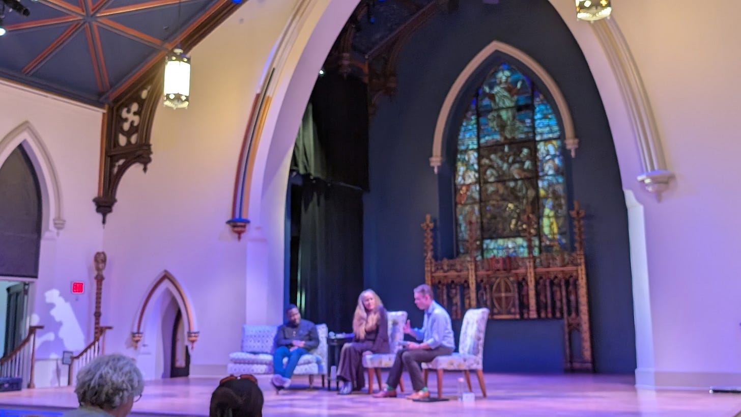 On March 7th, I drove from Annapolis, Maryland to Great Barrington, Massachusetts, to see Nora Bateson speak with Báyò Akómoláfé in a “W.EB. Du Bois Fellowship Conversation” put on by the Schumacher Center for New Economics, titled “Unnamed: A Conversation at the Edge of Sense”, moderated by Alex Forrester. I had been made aware of Bayo when, at Warm Data Host training in September of last year, I found myself in a room of lovely, thoughtful people who nearly all seemed aware of, and in awe of, this Nigerian philosopher who had hosted an event with Nora months before in Big Sur, California. I watched Bayo’s talk Ghostlights of the Political, Part 1, shared through another sensemaking/complexity community; and the odd, energetic, casual clarity with which he playfully, poetically riffed on new and interesting ontological experiments made me excited to see him speak with Nora.